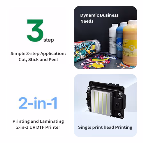 Go beyond limitations with our UV DTF printers. Featuring revolutionary single-head technology for effortless all-layer management and integrated lamination for peak efficiency, create stunning, durable designs on any material, any shape.